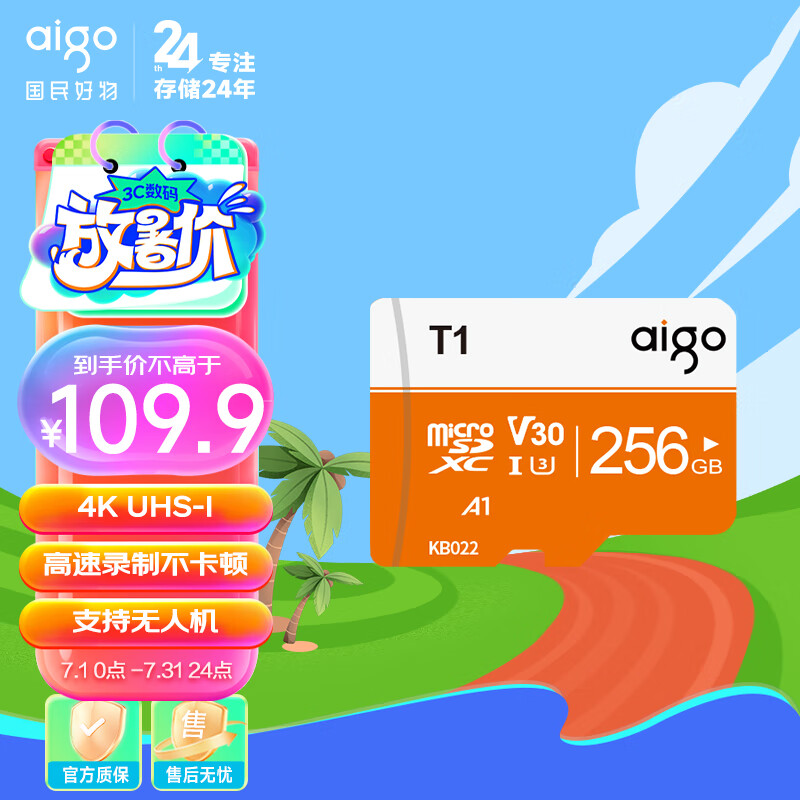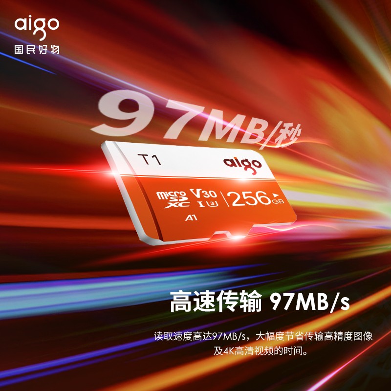 爱国者(aigo)256GB TF(MicroSD)存储卡 U3 A1 V30 4K内存卡 相机行车记录仪监控摄像头储存卡 T1读速100MB/s价格:109.90元!
