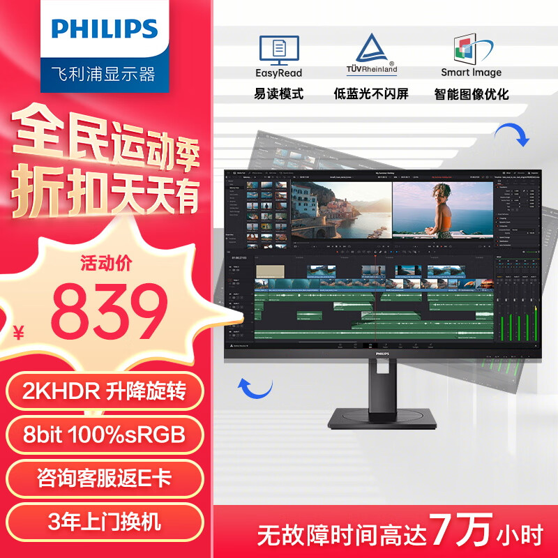 飞利浦(PHILIPS) 23.8英寸 2K 办公显示器 IPS屏 HDR 75Hz 低蓝光 HDMI+DP 旋转升降 壁挂 设计电脑显示器 245S9DR价格:839.00元!