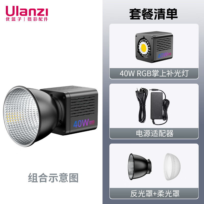 ulanzi优篮子40W RGB掌上补光灯电源适配器套装双色温内置电池炫彩COB灯摄影灯直播常亮灯柔光球直播摄影价格:498.00元!