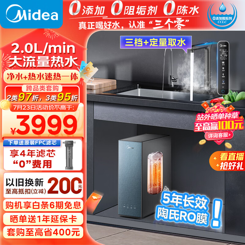 美的(Midea)家用净水器星河加热直饮一体机1000G 陶氏RO反渗透过滤 大流量2.46L/min 厨下即滤净饮机多档控温价格:3999.00元!
