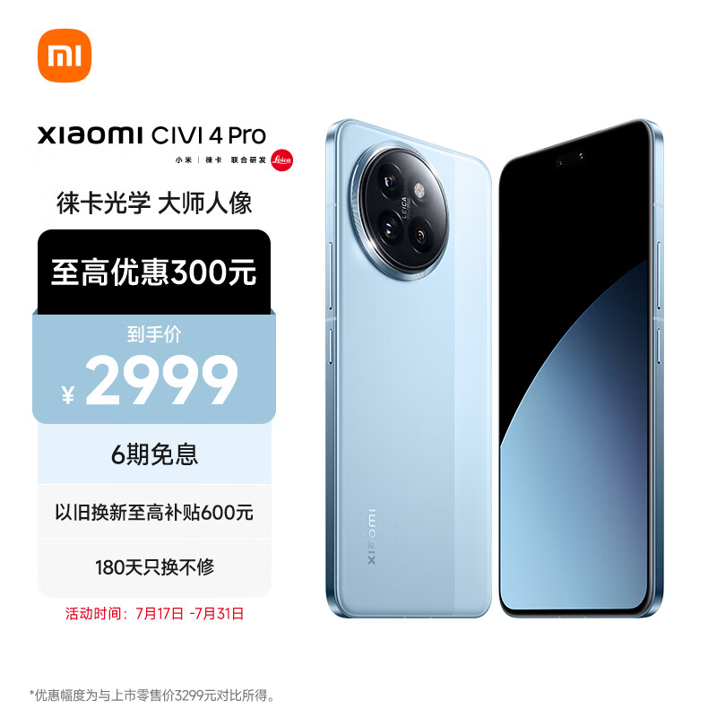 小米Civi 4 Pro 第三代骁龙8s 5000万徕卡专业人像镜头 12GB+512GB 微风蓝 5G拍照AI手机 小米澎湃OS价格:2999.00元!