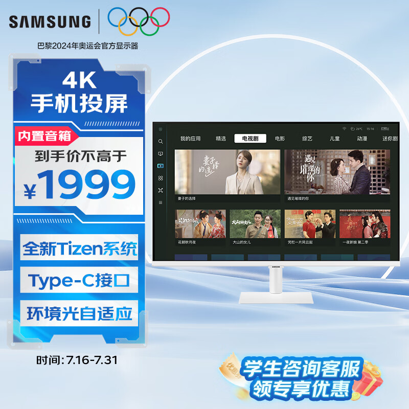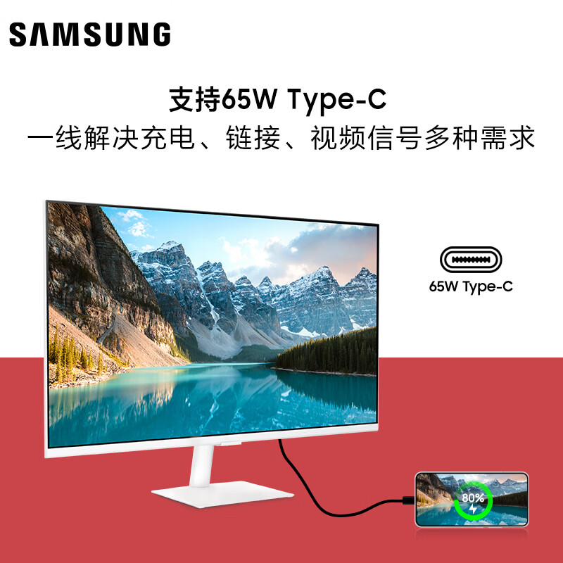 三星(SAMSUNG)32英寸 4K Type-C 65w 海量app 蓝牙连接 Tizen系统 内置音箱 M70C 办公 智慧显示器 S32CM703价格:2599.00元!