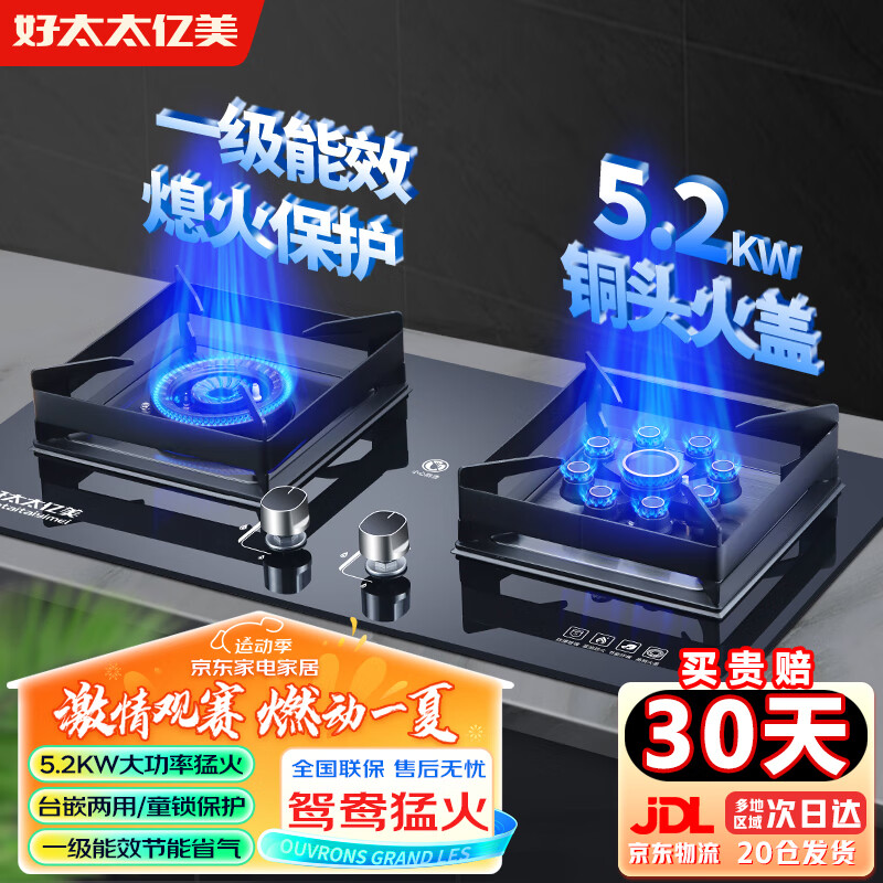好太太亿美液化气燃气灶双灶家用煤气灶5.2KW猛火台式嵌入式猛火炉具玻璃方架鸳鸯灶JZY-K06Y价格:339.00元!