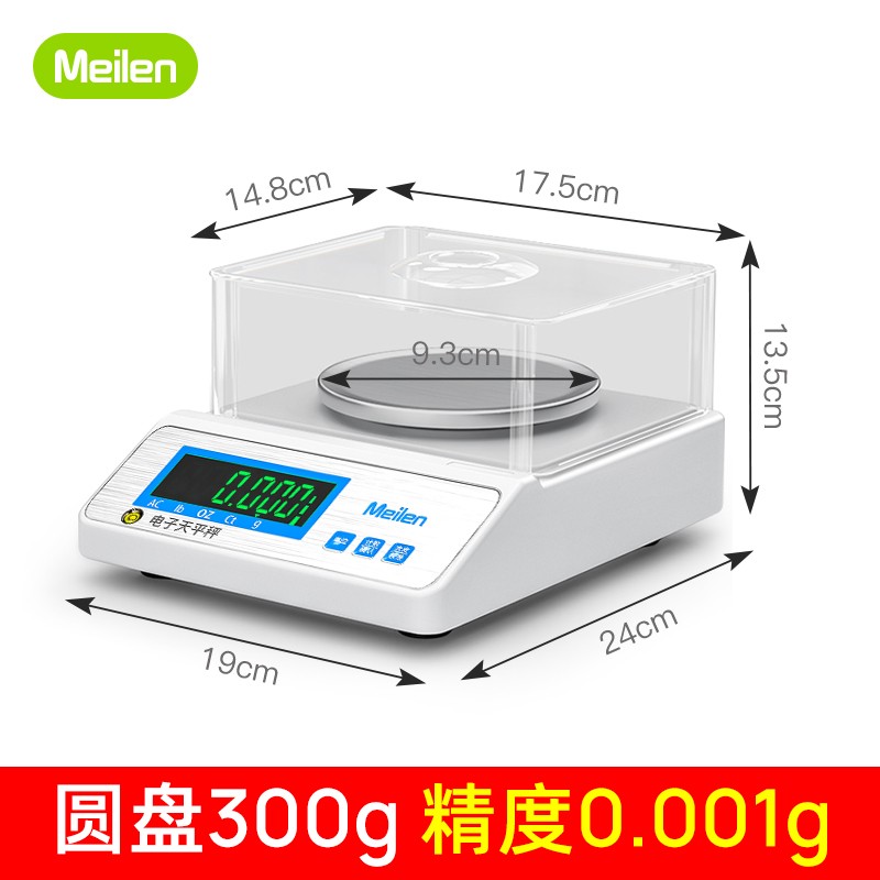 Meilen 电子天平0.01g0.001g高精度电子秤克称天平秤中药黄金珠宝秤实验室分析 圆盘-量程300g-精度0.001g-配防风罩砝码价格:539.00元!