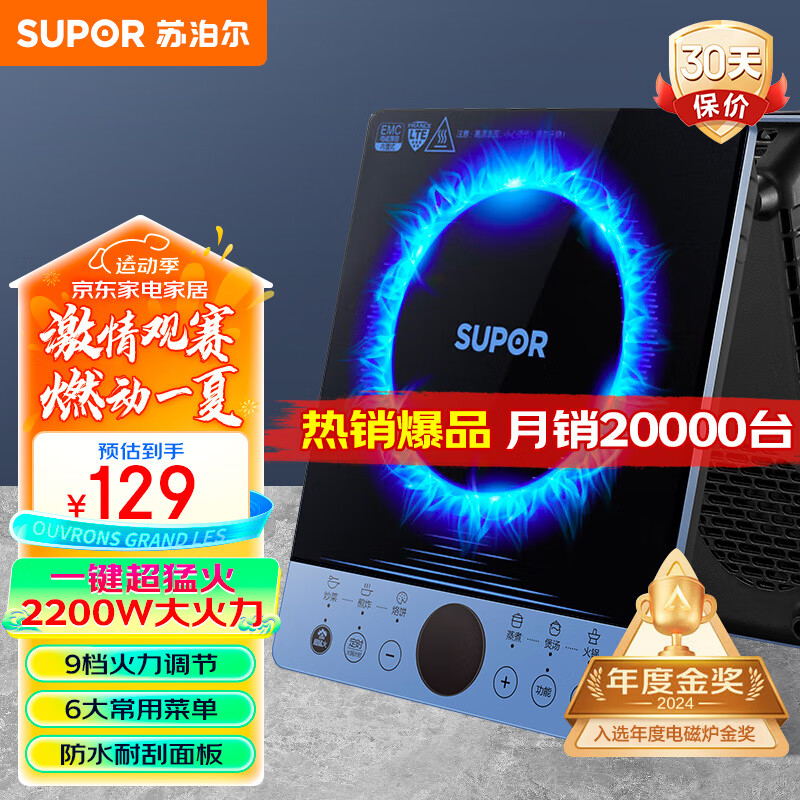 苏泊尔(SUPOR)家用大功率9档调节电磁炉 电磁灶 智能滑控 爆炒 分体式防水电磁灶 可定时 C22-IH30E9D 【单机】价格:129.00元!