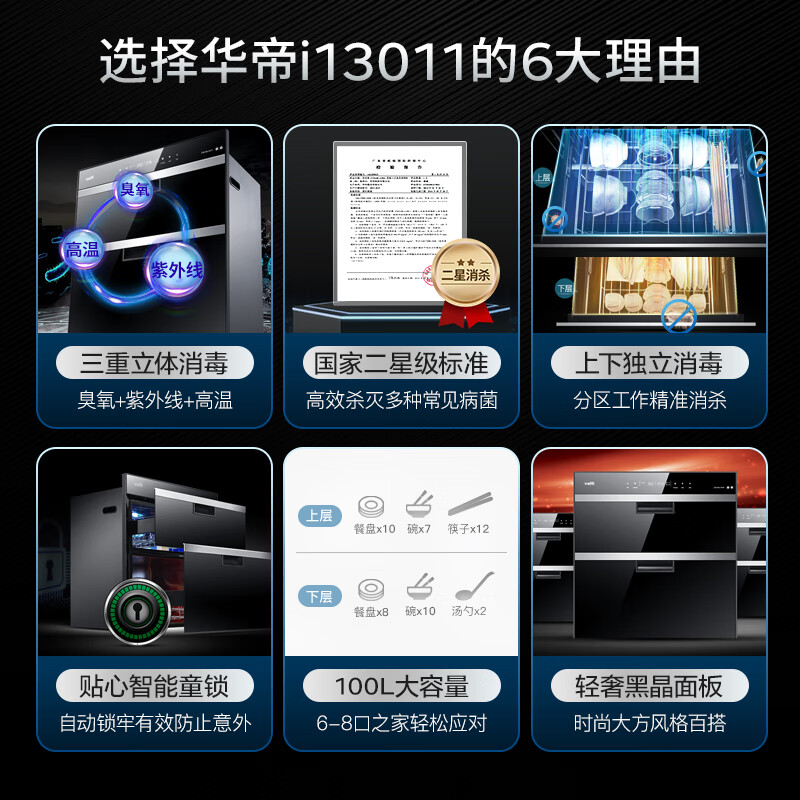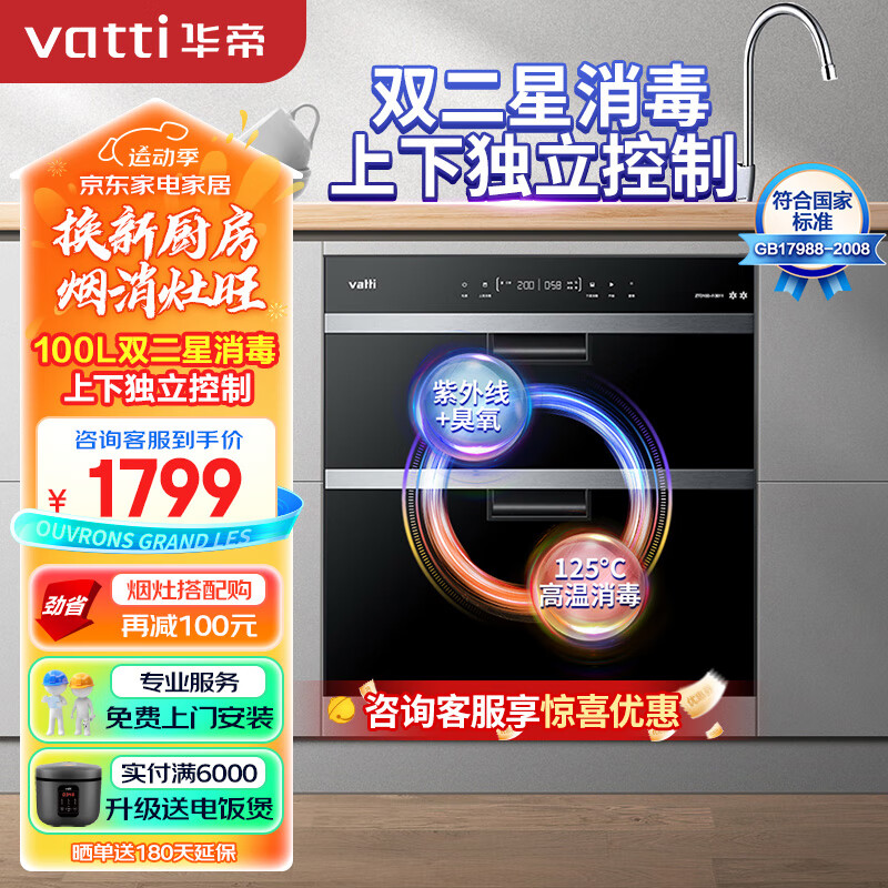 华帝(VATTI)消毒柜嵌入式家用100升消毒碗柜大升数大容量 紫外线高温三重消毒 125℃高温分层消毒i13011价格:1799.00元!