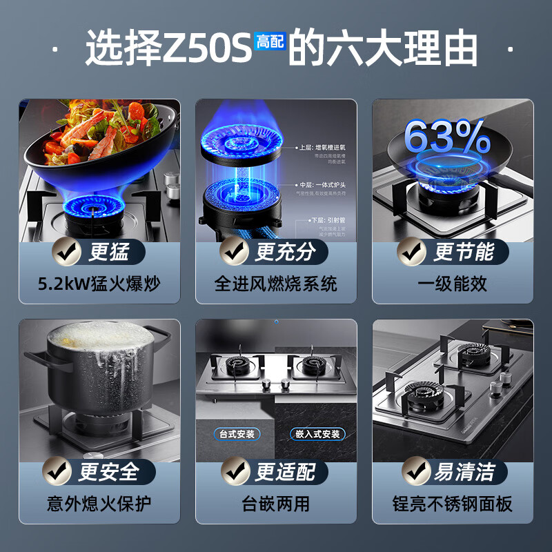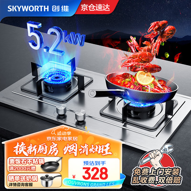 创维(Skyworth)燃气灶双灶具 5.2KW大火力天然气双灶 家用猛火炉具 台式/嵌入式不锈钢灶台 JZT-Z50S(天然气)价格:328.00元!