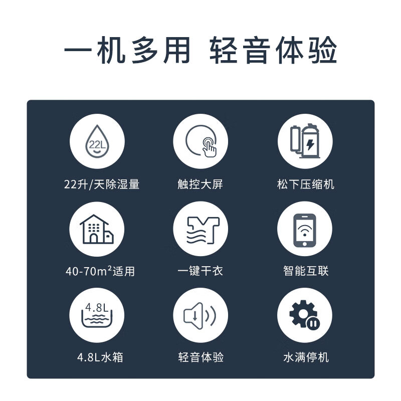 2、除湿效果:非常强悍。卫生间半小时从58降到37外观设计:比较出色,符合我的审美,方方正正,整整齐齐工作音量:可接受,45左右,如图。但肯定不会睡觉的时候用在卧室。除此以外应该都没问题操作难易:连wifi后很容易上手总之十分满意。物美价廉。兼顾松下压缩机,比较现代的设计和交互界面。京东送货一如既往的快。