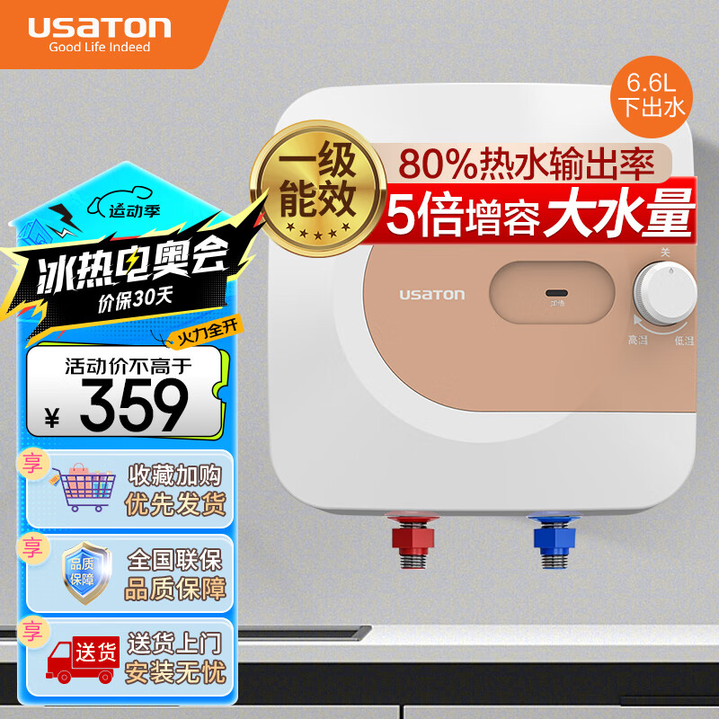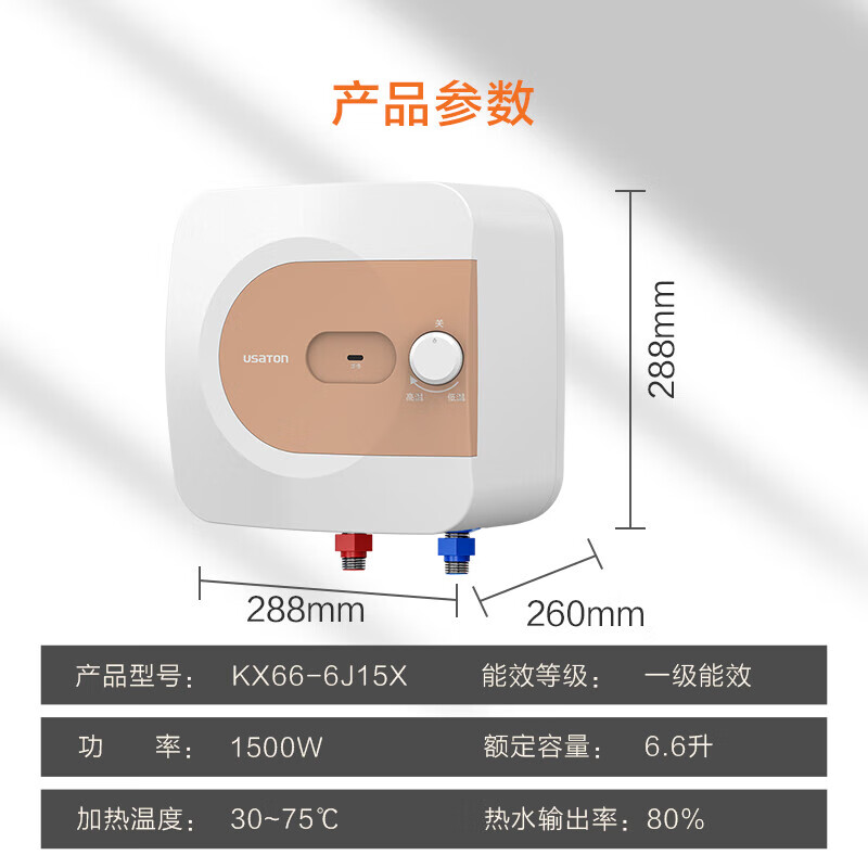 阿诗丹顿(USATON)6.6升小厨宝速热式厨房储水式电热水器迷你一级能效1500W下出水KX66-6J15X价格:419.00元!