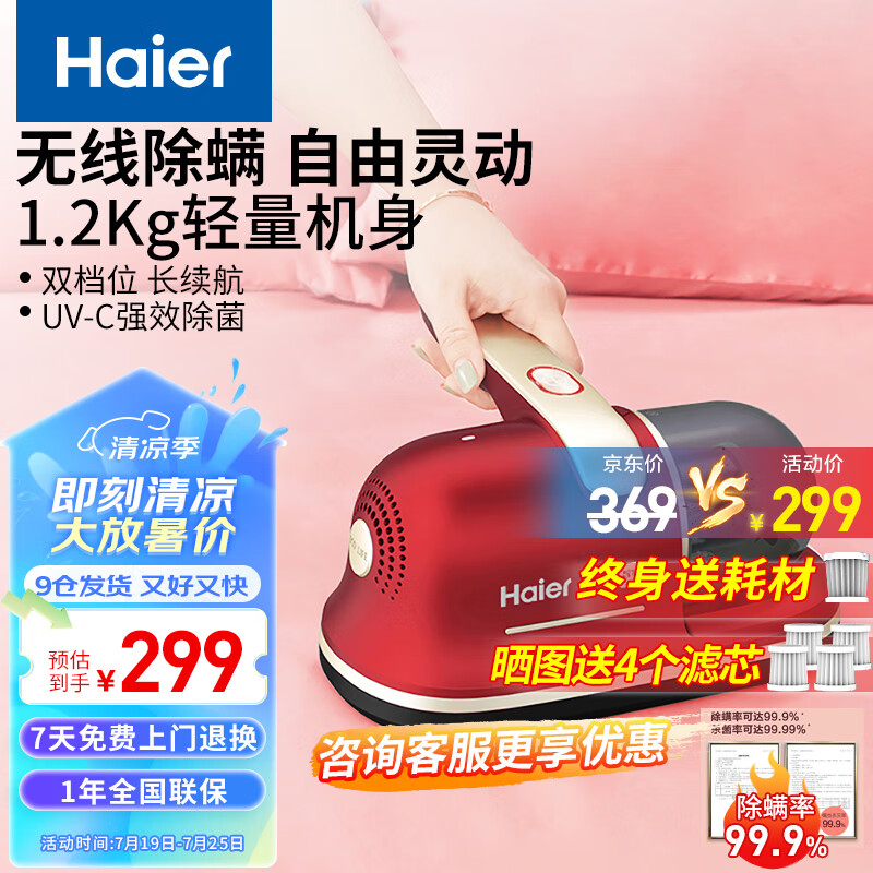 海尔(Haier)除螨仪无线手持家用床铺除螨机HZ-CL715R 吸力 紫外线杀菌除螨虫价格:299.00元!