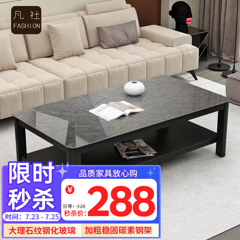 凡社茶几客厅简约现代 钢化玻璃仿岩板大理石纹双层储物办公茶桌价格:328.00元!