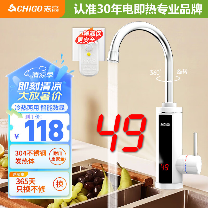 志高(CHIGO)电热水龙头厨房小厨宝热水宝加热器家用热水器电加热快速热卫生间水龙头阳台下进水 送漏保KBR-H7X价格:118.00元!