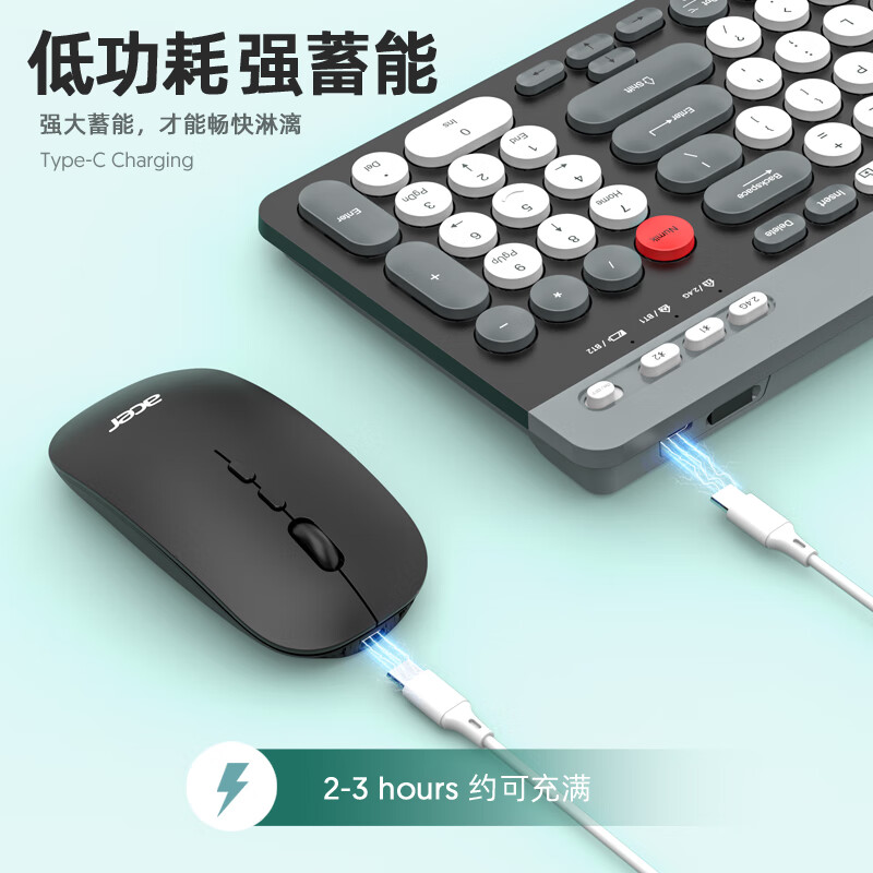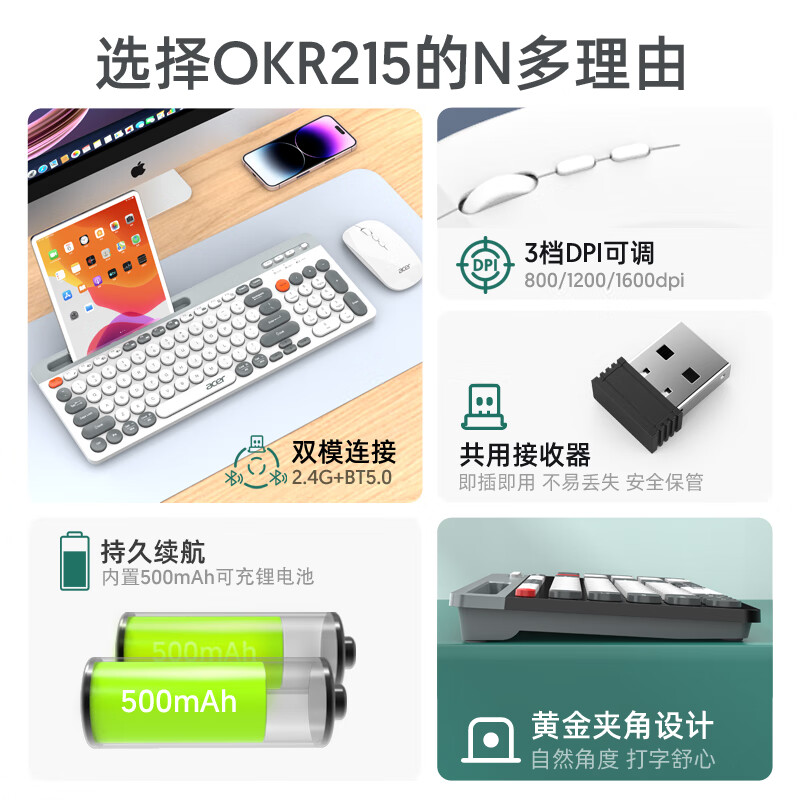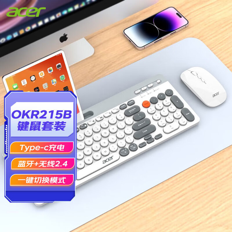 宏碁(acer) 充电双模键盘鼠标套装台式电脑笔记本平板手机通用 键鼠套装圆形键时尚拼色白灰【蓝牙+无线2.4】价格:129.00元!