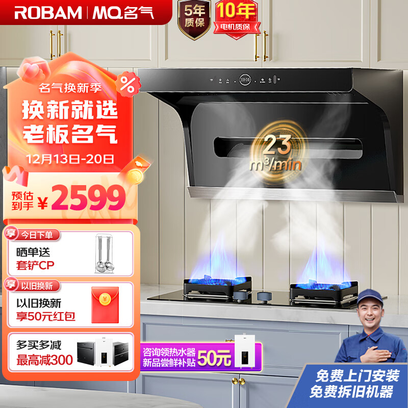 名气(MQ)老板抽油烟机7字型家用顶侧双吸油烟机灶具套装大吸力23m3烟灶套装燃气灶天然气5505+6812免费安装价格:2599.00元!