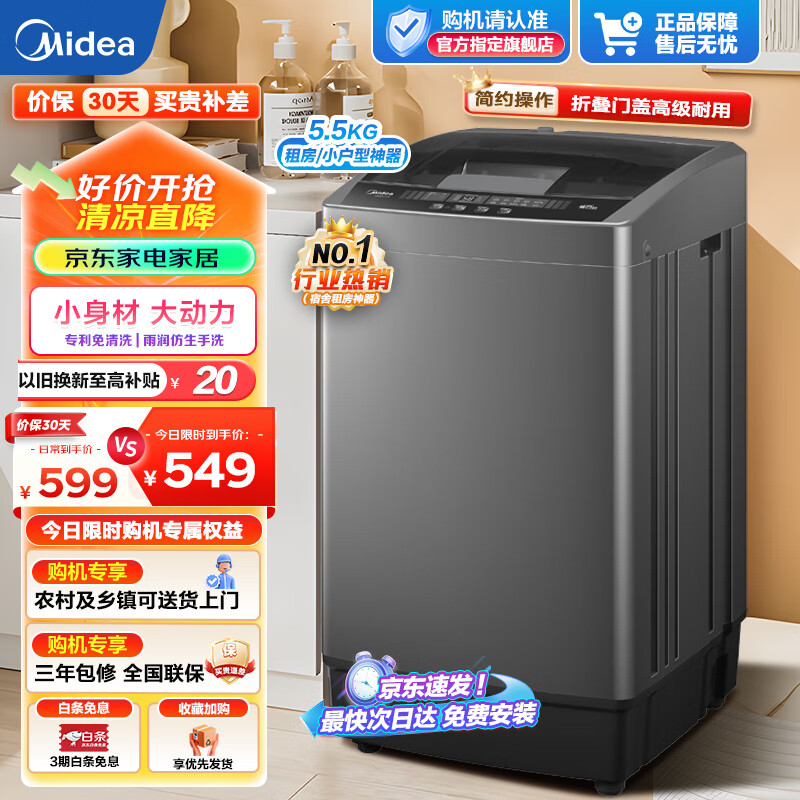 美的(Midea)波轮洗衣机全自动 小型迷你家用5.5公斤省空间宿舍租房家用智能预约免清洗水电双宽品质电机 小波轮销冠MB55V33E价格:589.00元!
