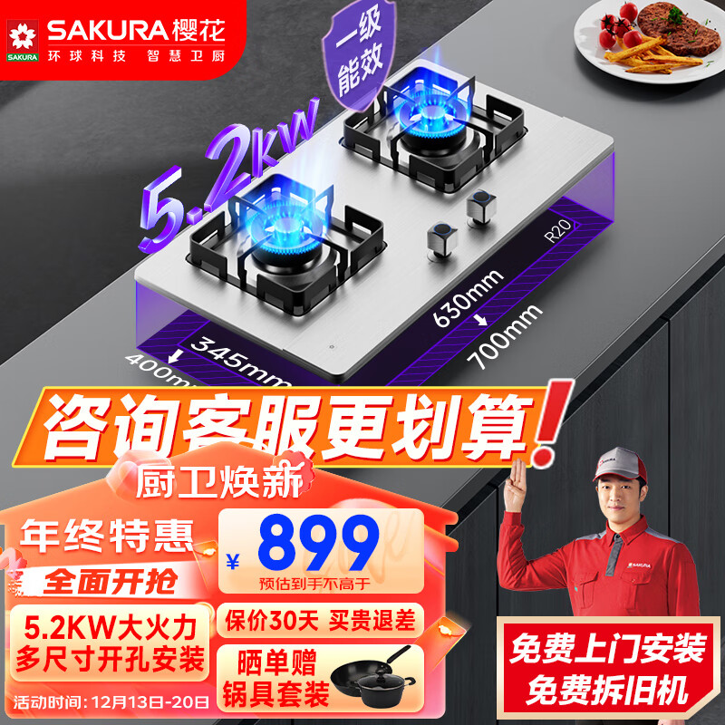 2、樱花是个老牌子了,朋友推荐的,京东百亿补贴买了。这款的炉具用来替换原来的大小尺寸刚刚好,不用重新开孔,这种大面板的现在好像不太多了。目前用了还不错,火力也可以,价格确实不贵,希望耐用。