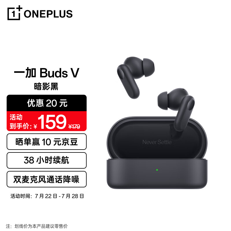 一加 Buds V 真无线蓝牙耳机 入耳式音乐运动电竞游戏耳机AI通话降噪通用oppo小米苹果华为手机 暗影黑价格:159.00元!