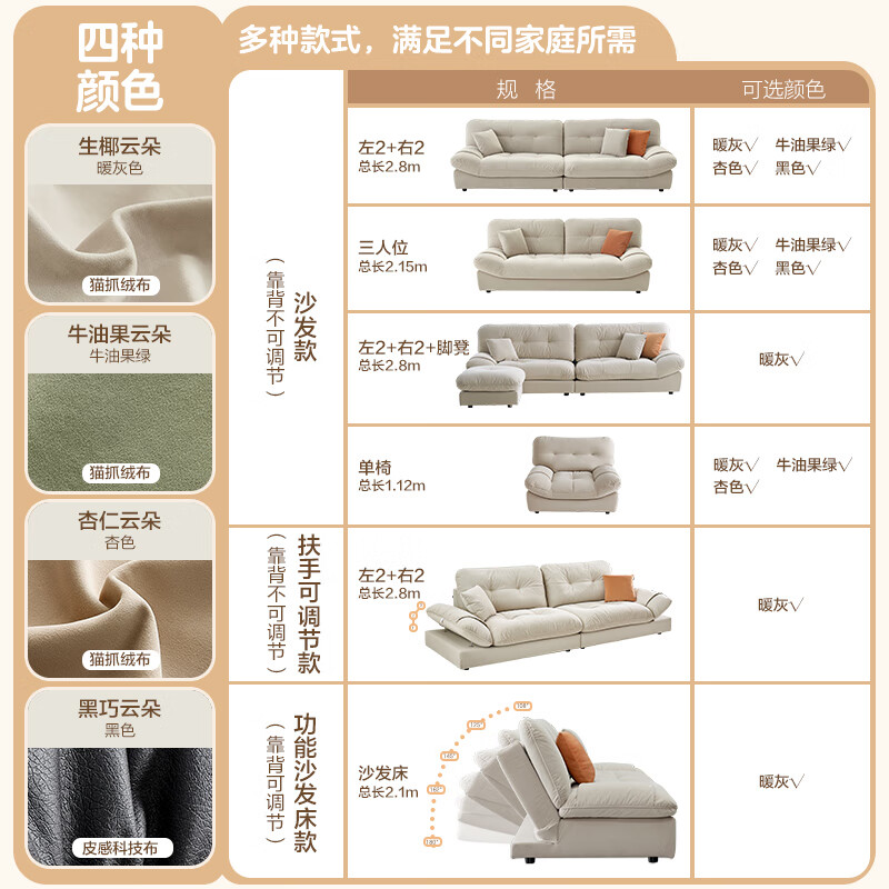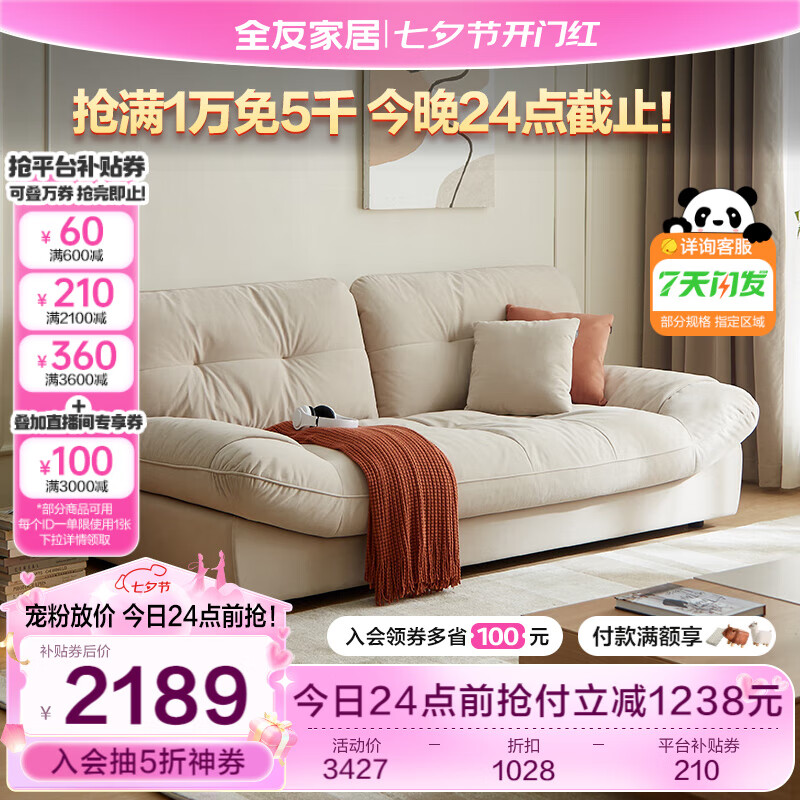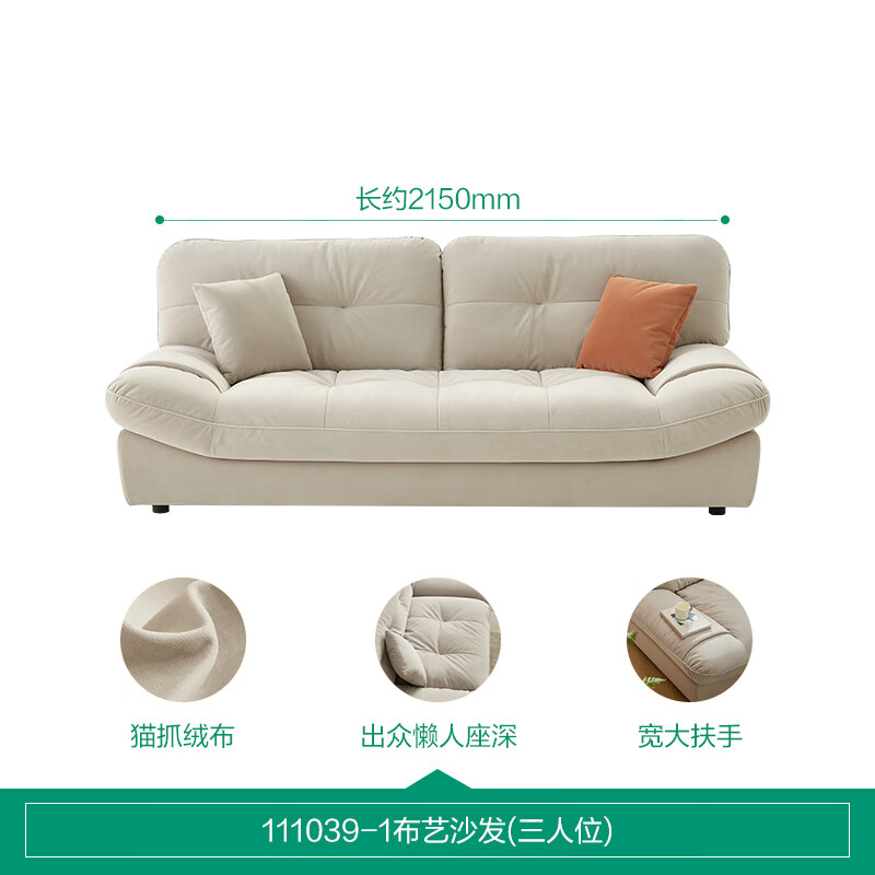 全友家居 奶油风布艺沙发客厅三人位直排防猫爪布云朵沙发卧室111039价格:3427.14元!