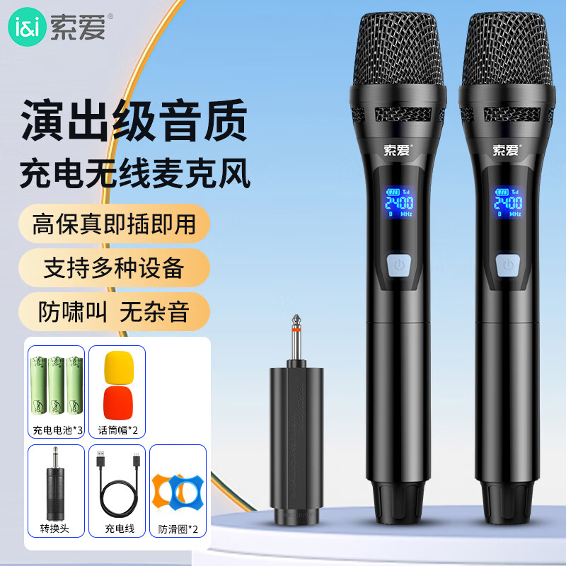 索爱(soaiy)话筒防啸叫无线充电麦克风K歌舞台卡包功放音响专用家庭KTV唱歌演讲会议主持 SA-WS2双麦黑价格:170.00元!