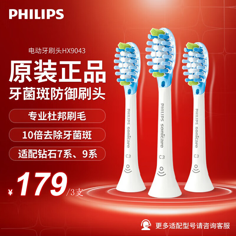 飞利浦(PHILIPS) 电动牙刷头替换头钻石系列适配HX9924HX9903HX9911HX9912HX9954HX9924 白色洁净型装HX9043/67 3支价格:209.00元!