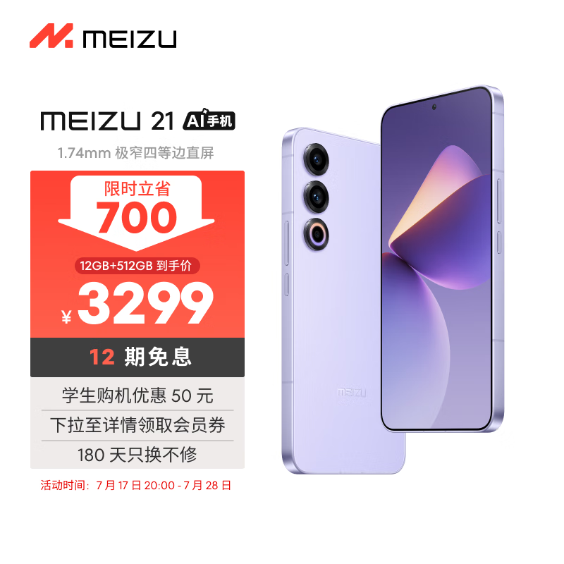 魅族(MEIZU)21 12GB+512GB 灵动紫 1.74mm极窄四等边直屏 骁龙8Gen3 2亿像素 80W超充 5G游戏学生拍照手机价格:3299.00元!