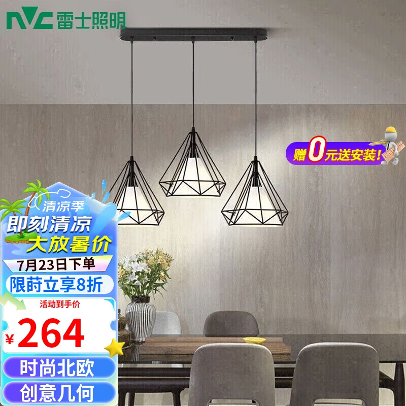 雷士(NVC)led餐厅吊灯具餐桌灯饰北欧简约可调节卧室吧台创意几何3头带光源价格:322.60元!