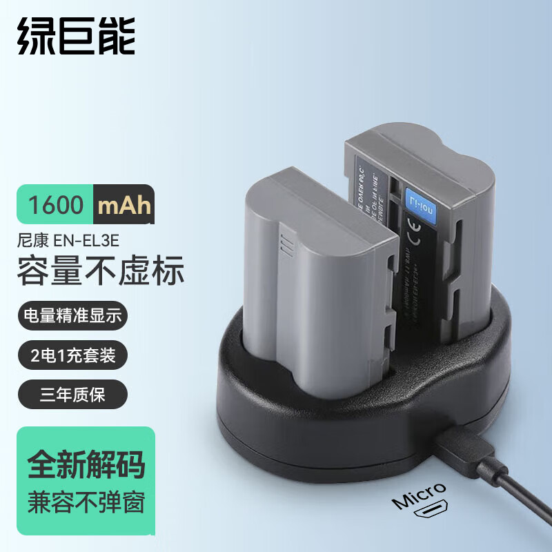 绿巨能(llano)尼康电池 EN-EL3E相机电池/充电器套装 适用D100/D50/D70s/D700/D80/D90等电池*2充电器*1价格:199.00元!