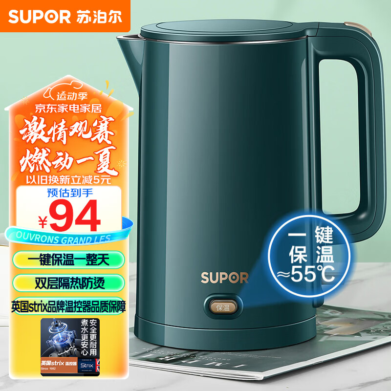苏泊尔(SUPOR)电水壶热水壶 1.5L全钢无缝双层防烫电热水壶 304不锈钢烧水壶 一键保温恒温 SW-15T101B价格:94.00元!