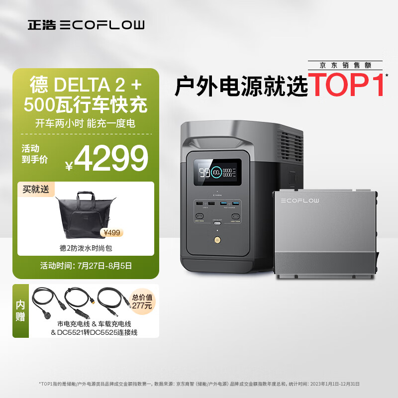 ECOFLOW正浩【德2+500瓦行车快充套装】户外移动电源露营自驾500瓦快充改装大功率智能行车充电器价格:4299.00元!