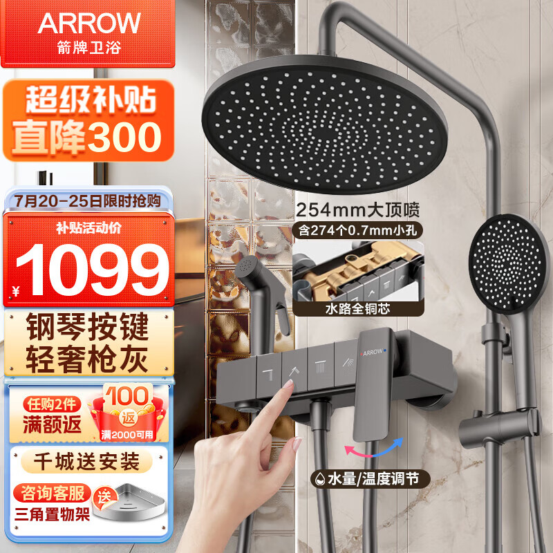 箭牌(ARROW) 淋浴花洒套装增压花洒全套莲蓬头淋雨器套装浴室花洒按键花洒 【枪灰色】按键丨冷热款价格:1399.00元!