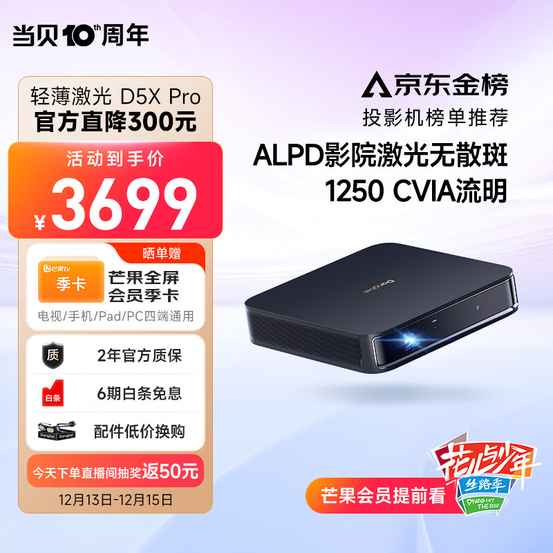 当贝 D5XPro 激光投影仪 家用投影机 家庭影院随身厅(轻薄旗舰 ALPD影院激光无散斑 1250 CVIA流明 4+32G )价格:3464.00元!