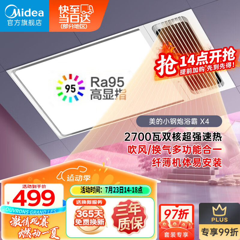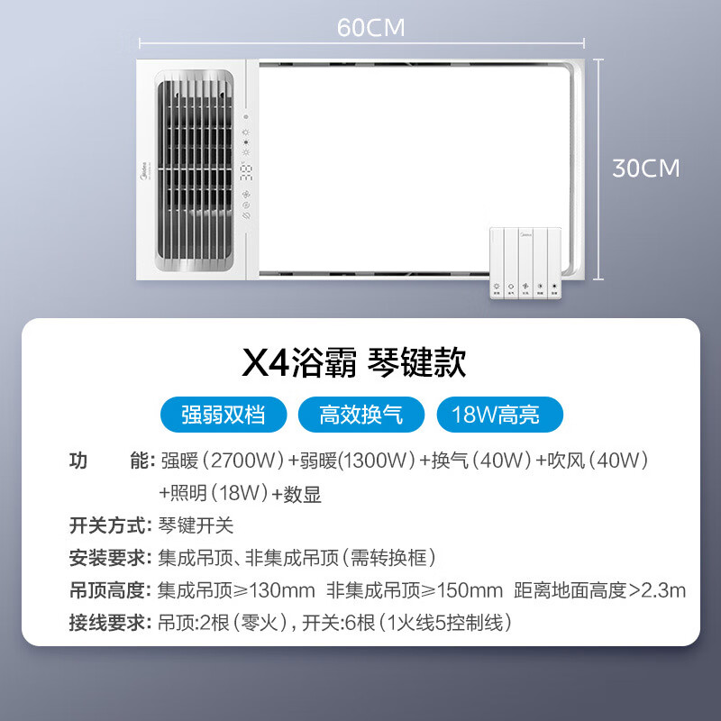 美的(Midea)浴霸双电机风暖300x600集成吊顶卫生间排气扇高显指暖风照明一体价格:499.00元!