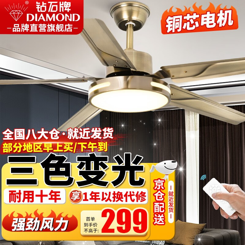 钻石牌(DIAMOND) 风扇灯吊扇大风力客厅餐厅带灯吊扇中式复古简约吊扇灯LED照明遥控一体风扇 5310古铜色吊扇灯/遥控(42寸)价格:329.00元!