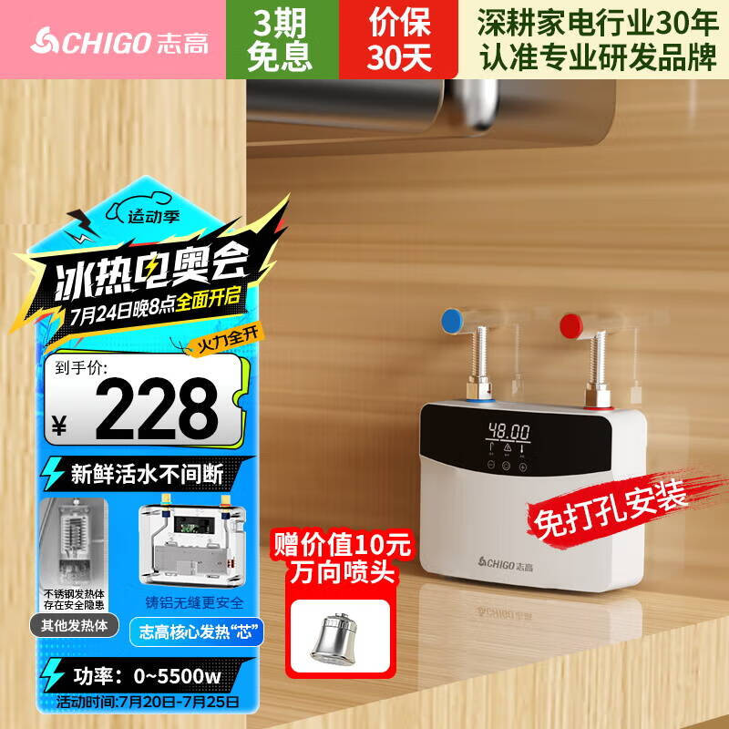 志高(CHIGO)即热式电热水器小厨宝5500W迷你厨房家用电热水龙头加热器集成免储水不限水量过水热水宝ZG-KB518价格:228.00元!
