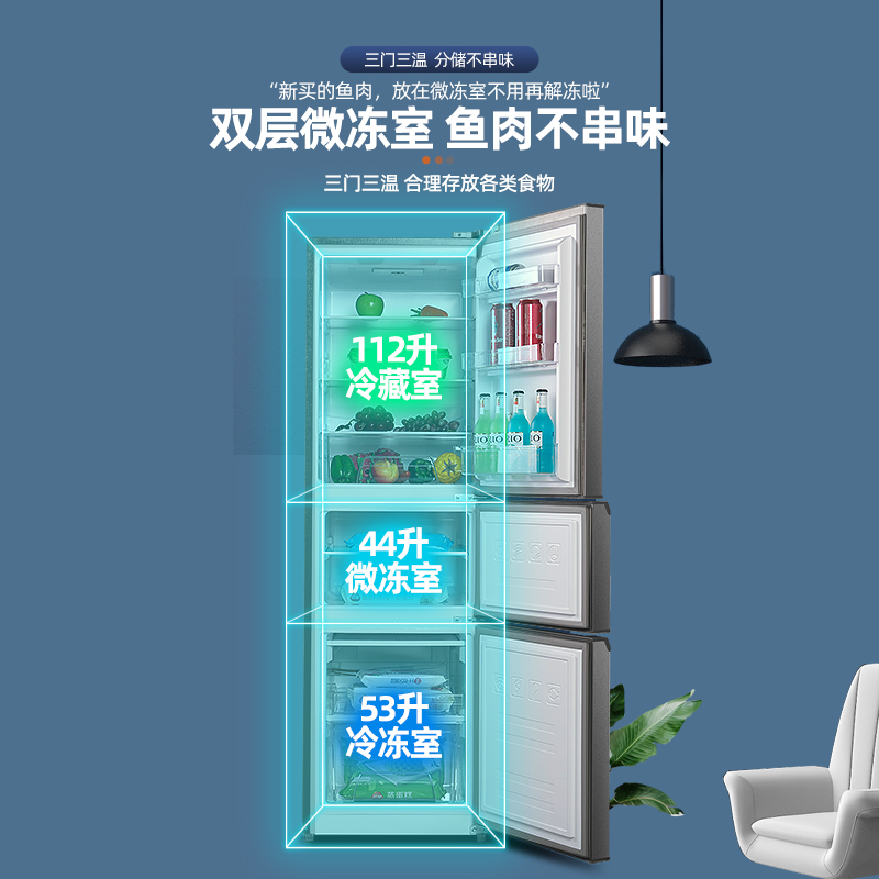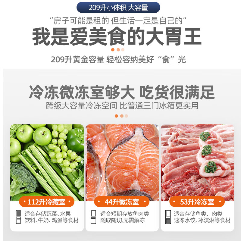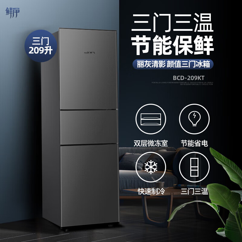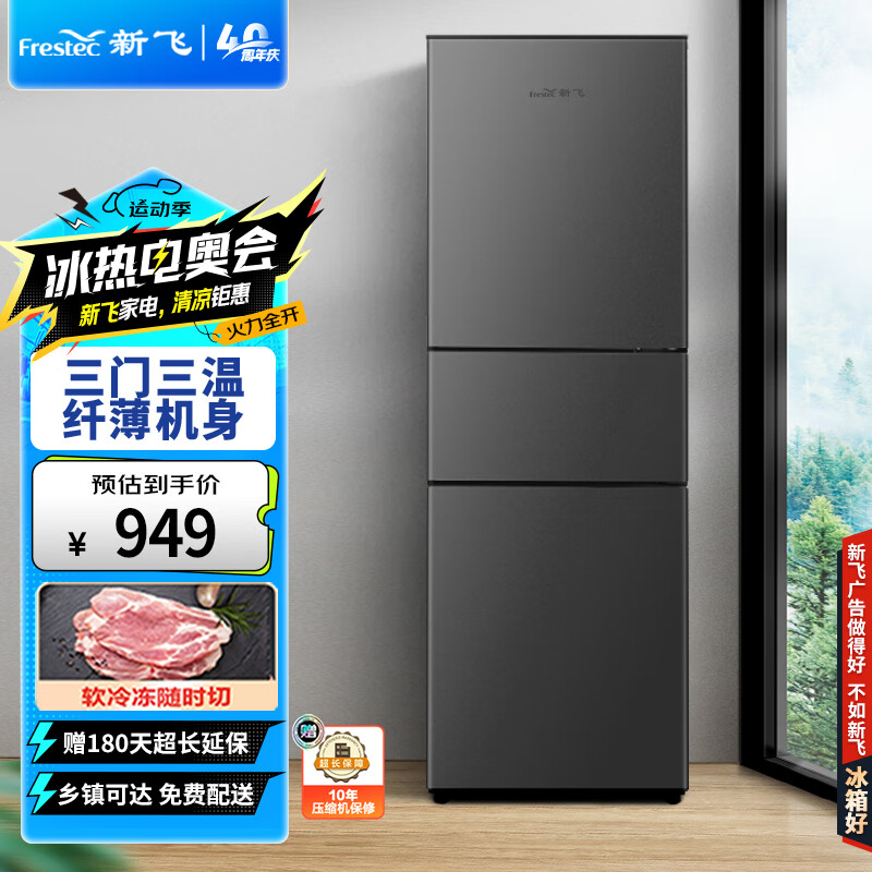 新飞(Frestec)209升三门三温区双层抽屉直冷家用租房低音节能小巧不占地软冷冻电冰箱 BCD-209KT价格:949.00元!