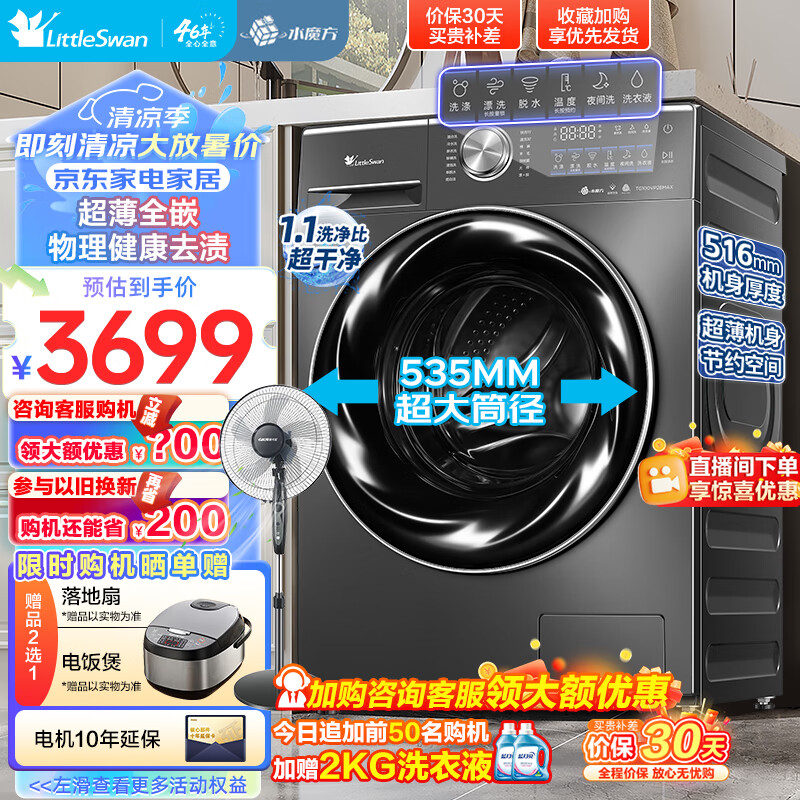 小天鹅(LittleSwan)滚筒洗衣机全自动 10公斤大容量家用 水魔方超微净泡 智能投放 超薄全嵌 小钢炮2.0 TG100VP28MAX价格:3699.00元!