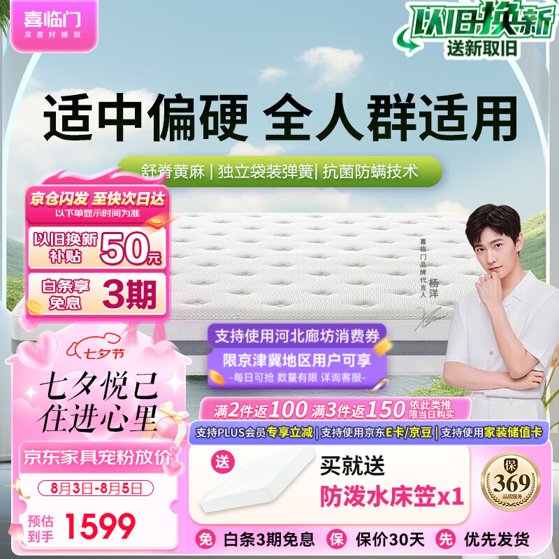 喜临门黄麻床垫 抗菌防螨独袋弹簧床垫 适中偏硬席梦思 千帆1.8x2米价格:1699.00元!