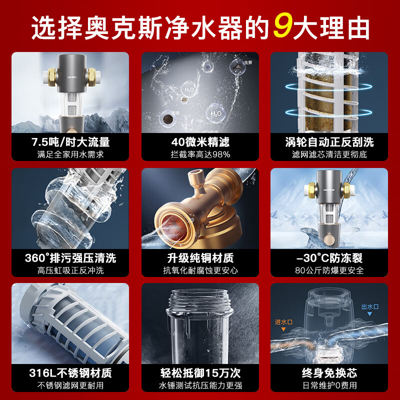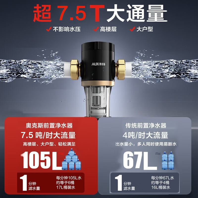 奥克斯(AUX)前置过滤器40微米自动反冲洗防爆7.5T大通量全屋家用净水器清洗表监控隔铅工艺中央净水机Q4 自行安装/付费上门安装(终身免换滤芯)价格:498.00元!