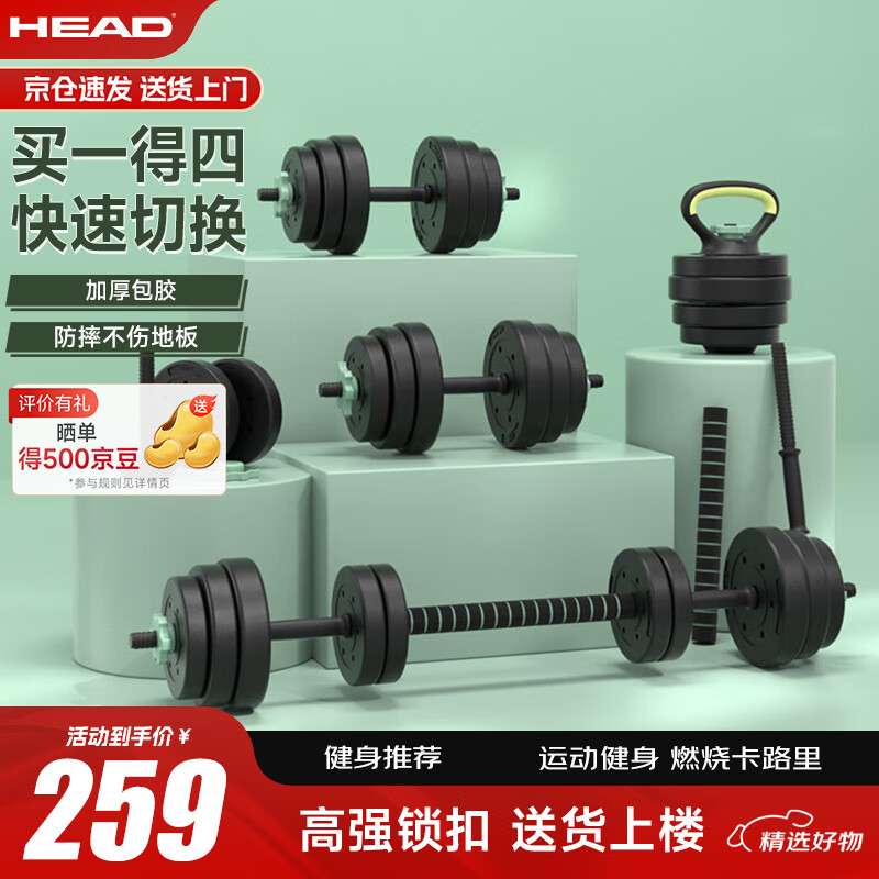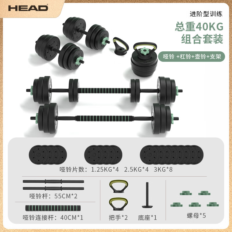 HEAD海德哑铃杠铃壶铃可拆卸调节套装组合男女通用40kg价格:259.00元!