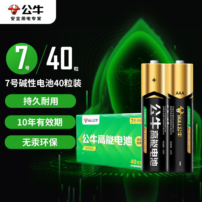 公牛(BULL)7号碱性电池40粒 适用于电动玩具/遥控器/无线鼠标/钟表/电子锁/无线门铃/手电筒等 GNV-PCALR3价格:120.00元!