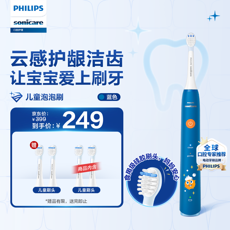 飞利浦(PHILIPS)儿童声波震动电动牙刷 男孩/女孩生日礼物 适用4-6-12岁 2种模式自带2支刷头温和清洁 蓝HX2432/01价格:259.00元!