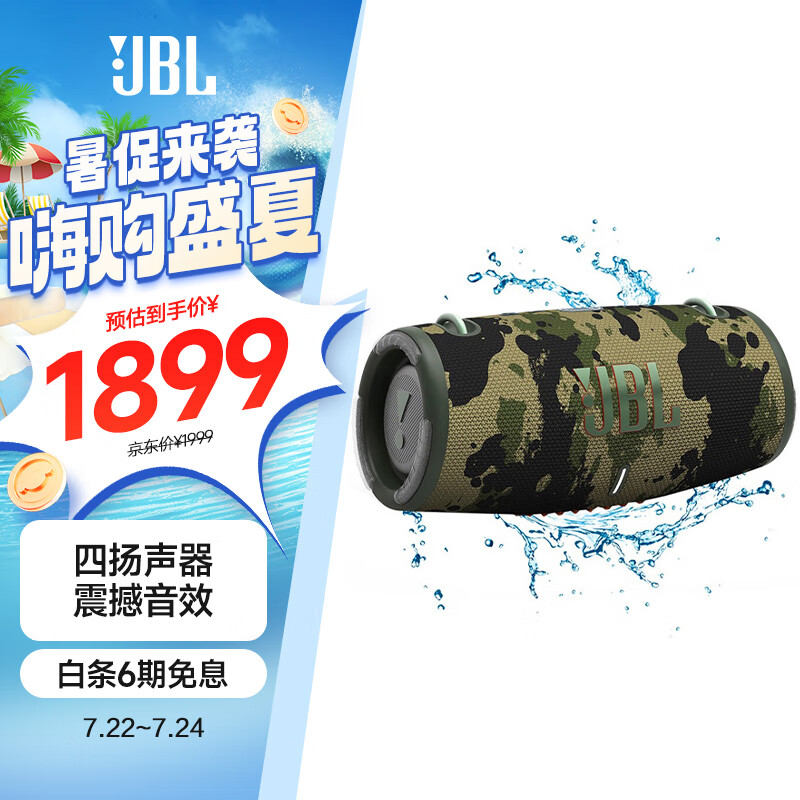 JBL XTREME3 音乐战鼓三代 便携蓝牙音箱 户外音箱 电脑音响 低音炮 四扬声器系统 防尘防水 迷彩色价格:1899.00元!