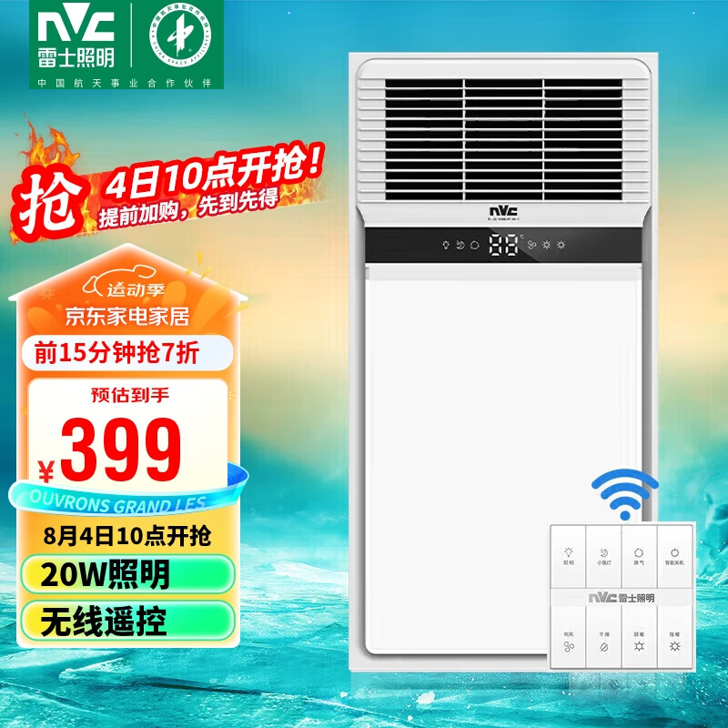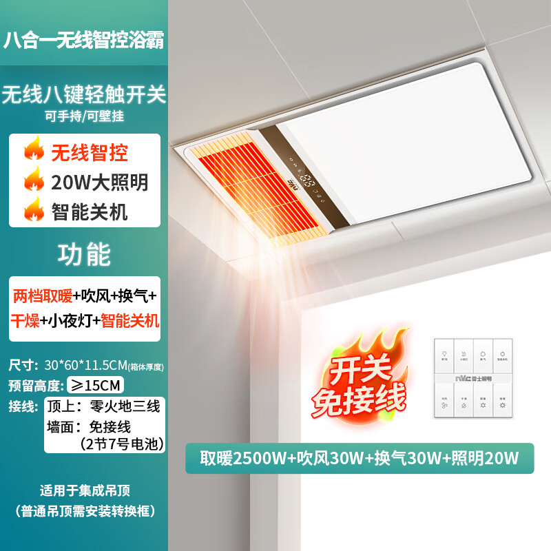 雷士(NVC)八合一智能无线风暖浴霸排气扇照明一体卫生间暖风机集吊Y246价格:569.00元!