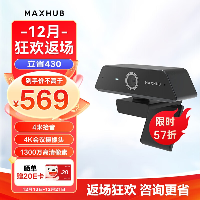 MAXHUB视频会议摄像头/智能变焦1300万高清4K分辨率内置麦克风/办公教育网课直播会议摄像机UC-W20价格:569.00元!