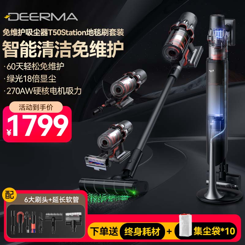 德尔玛(Deerma)T50station无线自集尘吸尘器免维护智能基站免倒垃圾 大吸力长续航绿光显尘宠物毛发T50S 七夕礼物价格:1799.00元!