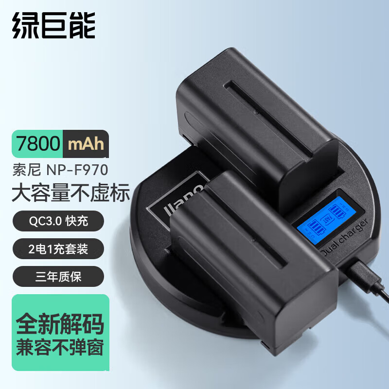 绿巨能(llano)索尼电池 NP-F970相机电池 QC3.0快充充电器 F550 F570 F930 F770 F750等 电池*2充电器*1价格:309.00元!