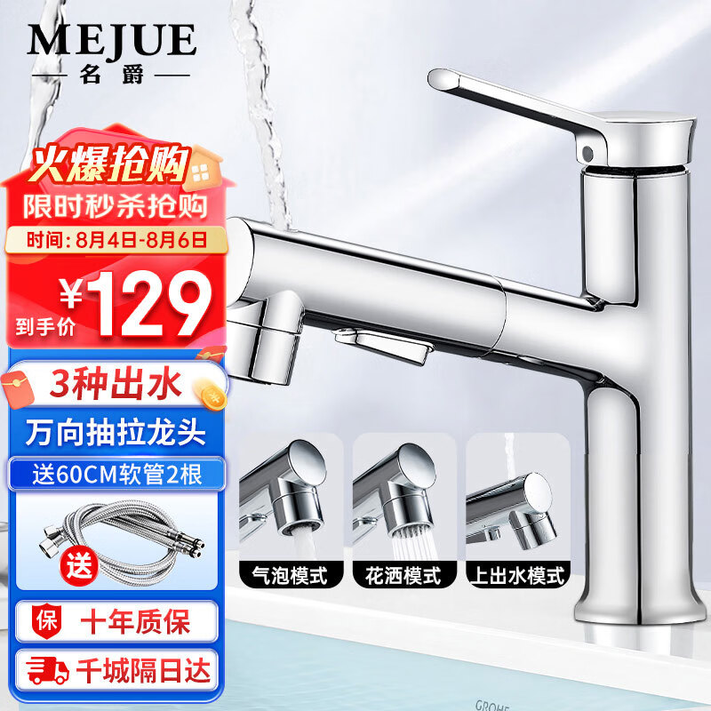 名爵(MEJUE)浴室面盆抽拉水龙头 3功能冷热双控卫生间台盆漱口龙头Z-012242价格:139.00元!