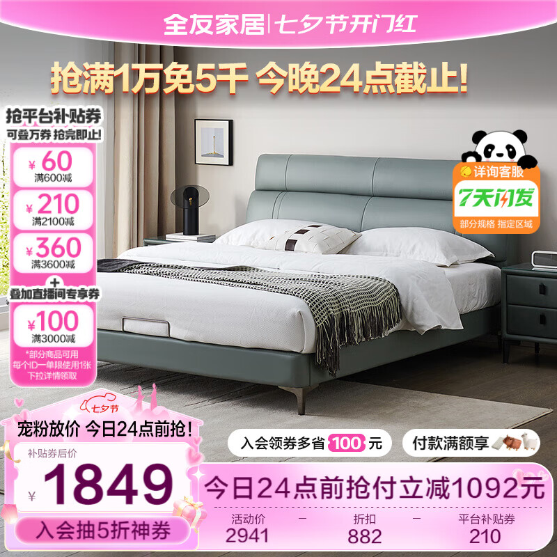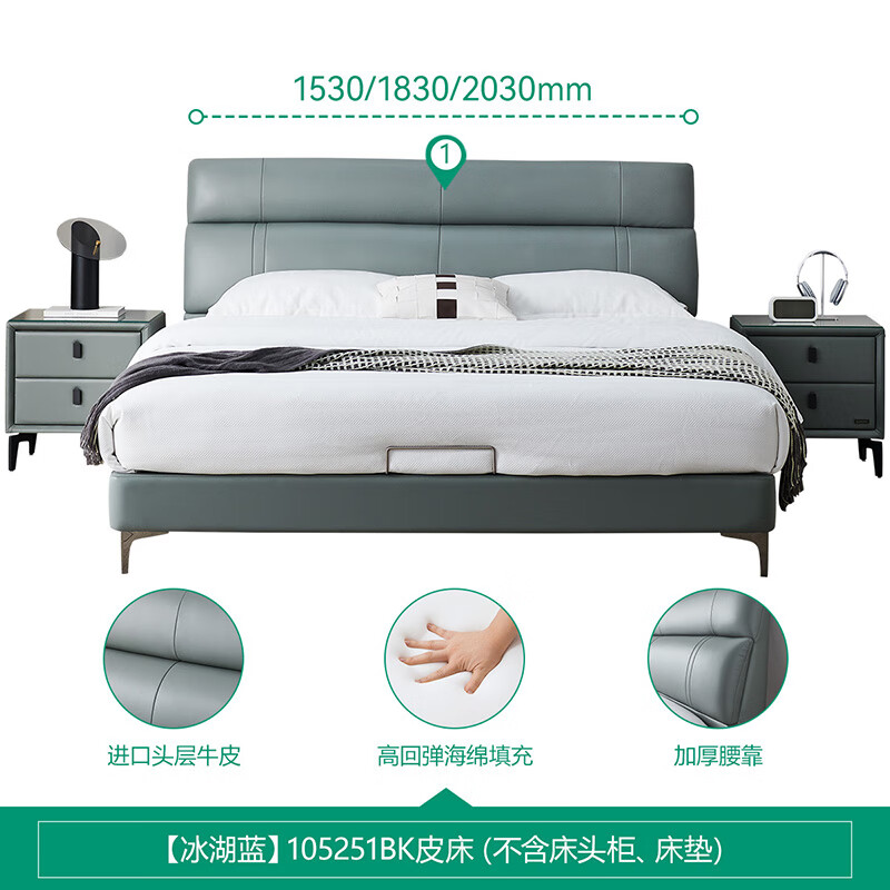 全友家居 真皮床 头层牛皮现代简约主卧室双人皮艺软包大床轻奢105251价格:2941.43元!