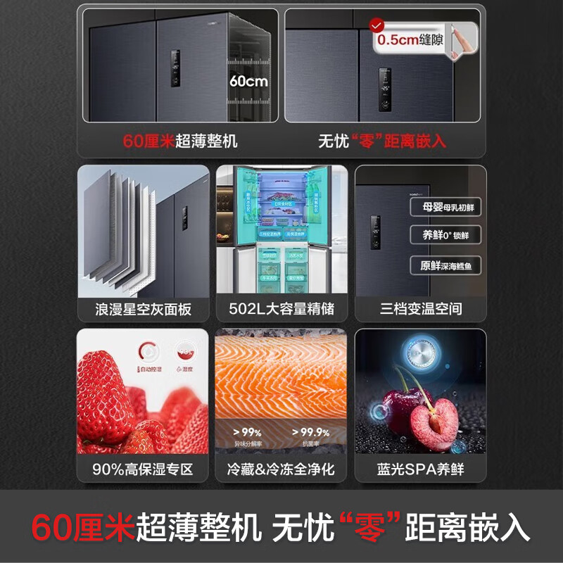 容声(Ronshen)【60cm平嵌】502升十字双开四开门超薄零距离嵌入式一级能效变频底部散热家用无霜超大容量冰箱 灰色 星空灰BCD-502WD1FPQ价格:5099.00元!