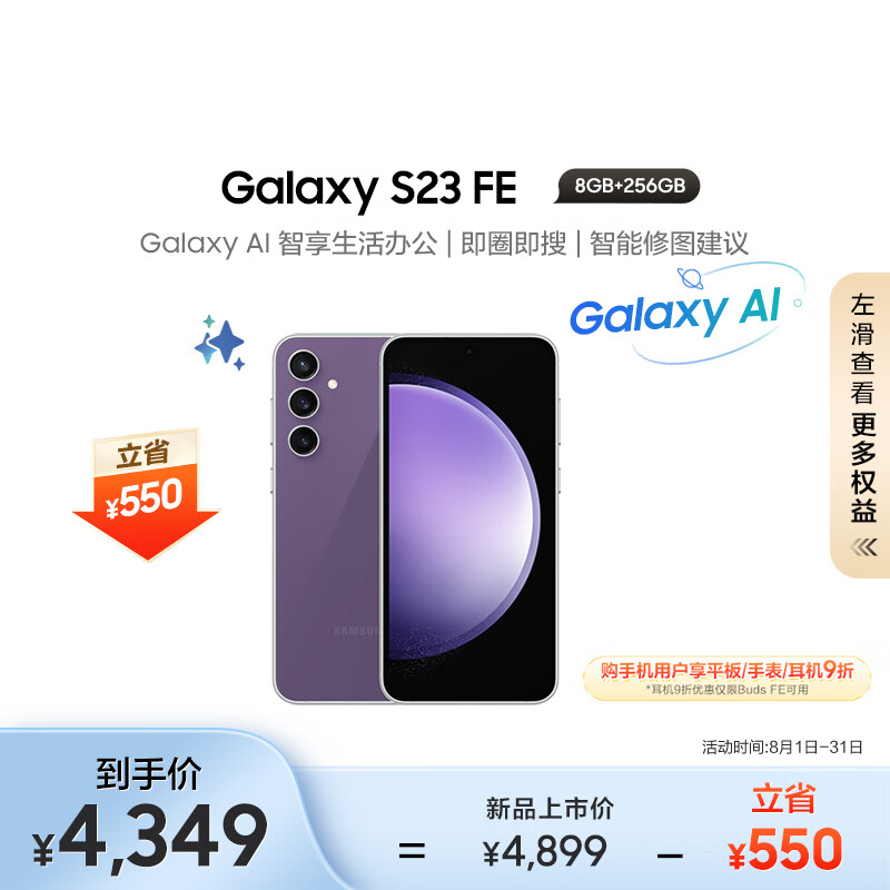三星(SAMSUNG)Galaxy S23 FE AI手机 双光学防抖 5000万像素 拍照手机 同声翻译 5G长续航手机 8GB+256GB 浆果紫价格:4349.00元!